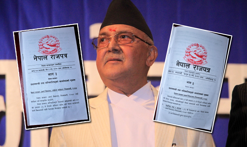 उक्त निर्णय २०७४ फागुन ११ गतेको राजपत्रको खण्ड ६७ को अतिरिक्ताङ्कमा प्रकाशित भएको थियो । यो अङ्कमा प्रधानमन्त्री कार्यालयअन्तर्गत ३८ बुँदामा प्रधानमन्त्री तथा मन्त्रिपरिषदको कार्यालयको कार्यविभाजन गरिएको छ ।