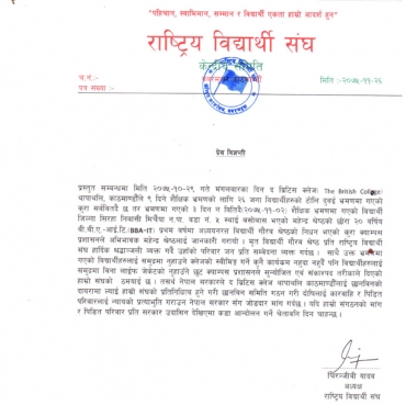 काठमाडौं, २६ फागुन । थापाथलीस्थित द ब्रिटिश कलेजलाई कारबाही गर्न राष्ट्रिय जनता पार्टी नेपालनिकट राष्ट्रिय विद्यार्थी संघले माग गरेको छ ।