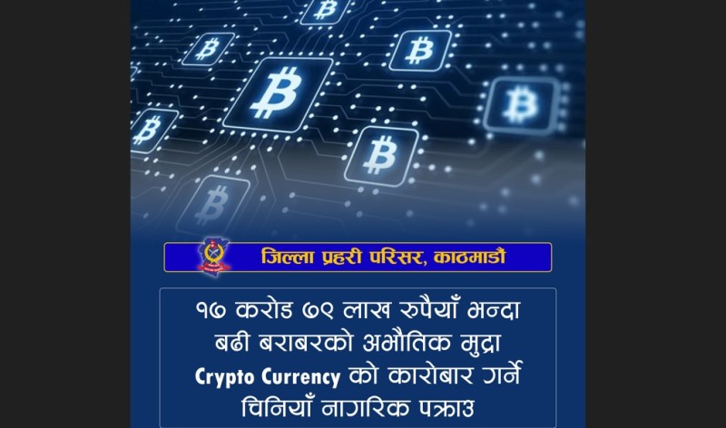 काठमाडौं । विभिन्न सामाजिक सञ्जालबाट अभौतिक मुद्रा क्रिप्टो करेन्सी कारोबार गर्ने एक चिनियाँ नागरिक पक्राउ परेका छन् ।