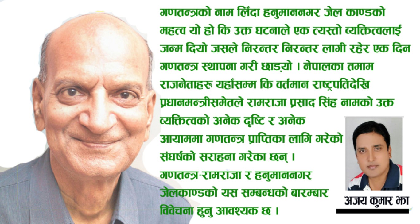 वास्तवमा त्यही अन्यायले गर्दा त्यो बालकको गणतान्त्रिक अवतरण भयो । त्यसैले हनुमाननगर जेल काण्डको महत्व वर्णन गर्नु त्यति सजिलो छैन । विश्व राजनीतिक परिवर्तनको लहरलाई नेपालसँग जोड्ने काम रामराजा प्रसाद सिंहले तबसम्म गरी रहे, जबसम्म कि यो मुलुकले राजनीतिक परिवर्तनको पूर्णता प्राप्त गरी सकेन ।
