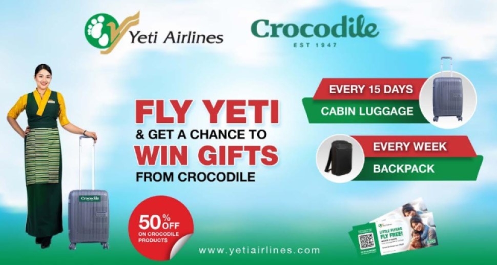 यती एअरलाइन्स र क्रोकोडाइल लगेज विचको यो सहकार्यले यती एअरलाइन्सका यात्रुले पाउने विशेष छुटका अलावा प्रत्येक हप्ता क्रोकोडाइल ब्यागप्याक तथा प्रत्येक पन्ध्र दिनमा क्रोकोडाइल क्याविन लगेज उपहार स्वरुप जित्न सक्नेछन् । यती एअरलाइन्सले आफ्ना यात्रुहरु विच गर्ने लक्कि ड्र मार्फत विजेता घोषणा गरि उपहारहरु प्रदान गरिनेछ ।