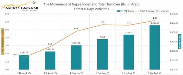 याँ बर्ष ०७५ लागेपछि साता दिनको सेयर कारोबारमा लगानीकर्ताको सम्पत्ति एक खर्ब ८६ अर्बले बढेको छ ।